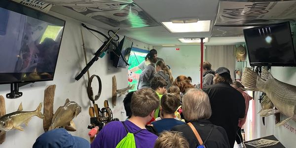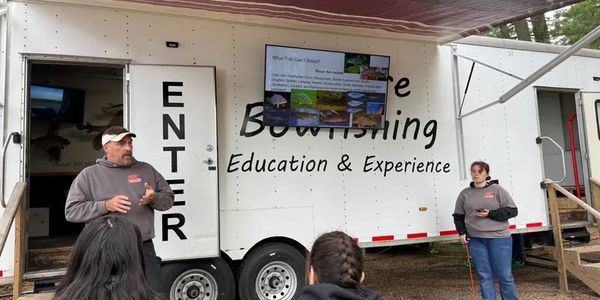 Our display offers a unique opportunity to try out bowfishing. Our custom tank has two target fish that can "swim". Giving you the feel for shooting into water, and at moving targets. Shooting the bow is the easy part. Refraction is our greatest hurdle to overcome. The best part, there is NO AGE LIMIT!!! We have assisted everyone from 2 to 85.